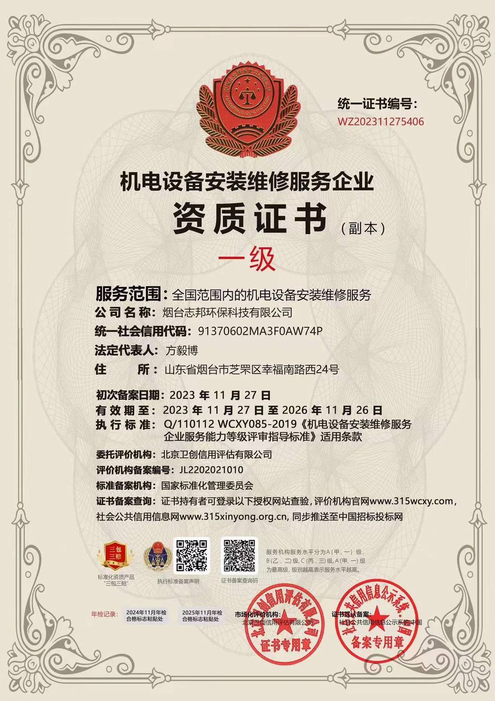 機電設(shè)備安裝維修服務(wù)企業(yè)資質(zhì)證書 一級